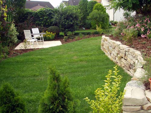 Um Höhe in ihren Garten zu bringen, arbeiten wir häufig mit Trockenmauern aus Sandstein, Kalkstein (Jura, Muschelkalk), Granit und Betonstein. So entstehen mit Senkgärten, Hochbeeten und Böschungssicherungen dekorative Elemente.